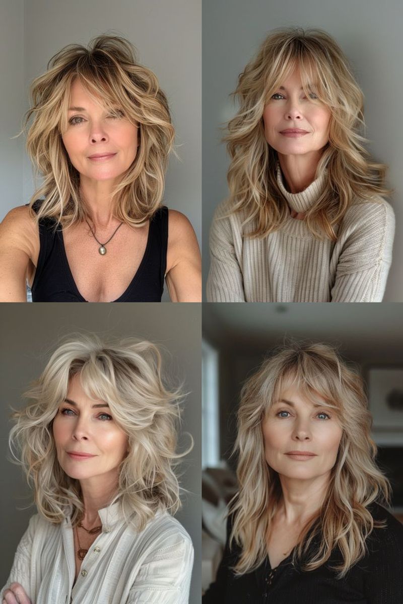 When paired with long layers, this combination creates a soft, romantic look that feels fresh and youthful. The angle of the bangs lifts your face visually, counteracting any downward drift that comes with age.